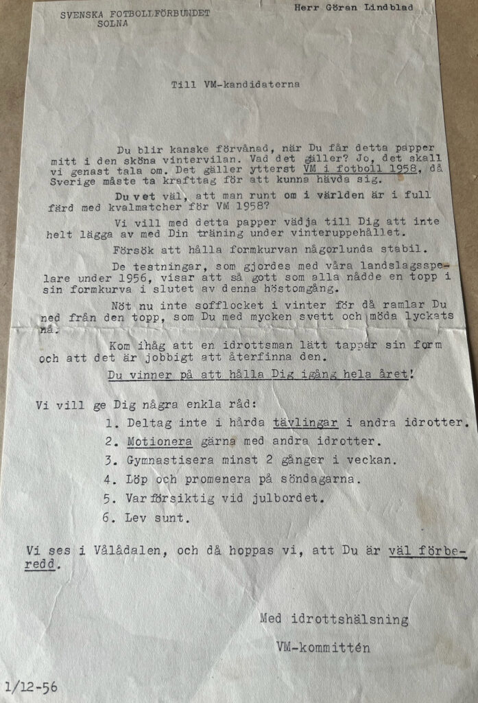 Efter landskampen började planeringen inför VM 1958 och Göran var bl.a. med på ett träningsläger i Vålådalen. Han fick också ett brev där han uppmanades att träna även under vintern inför kommande säsonger: